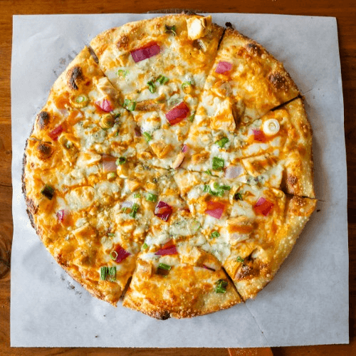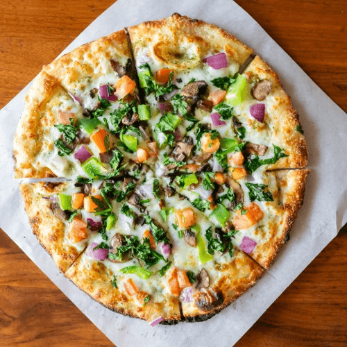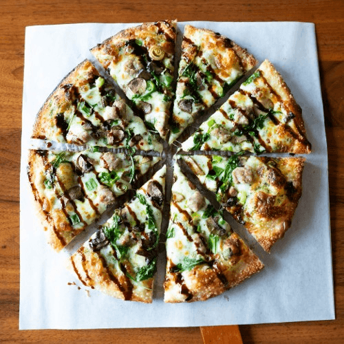 Alfredo Sauce, Mozzarella Cheese, Parmesan Cheese, Lightly Salted Crust, Italian Seasoning, Chicken, Mushrooms, Arugula, with a White Truffle Oil finish