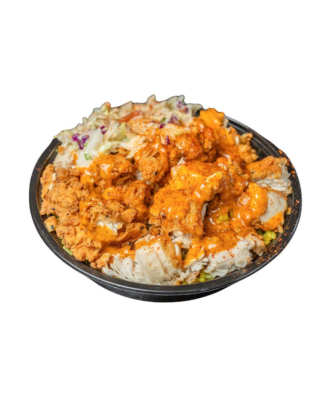 Pilaf rice, krispy chicken, coleslaw, nashville sauce, crispy onions.