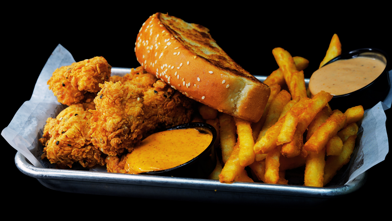 2 jumbo krispy chicken tenders, toast, pink sauce, nashville sauce, side of fries.