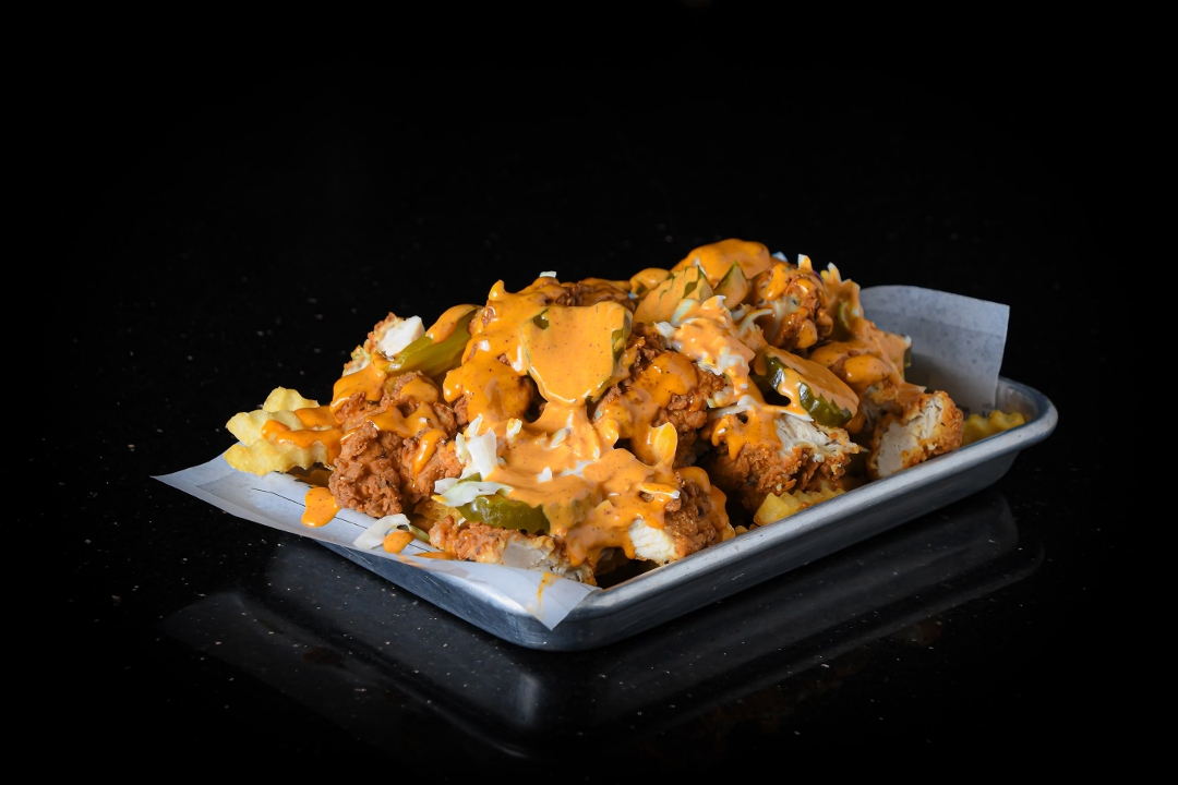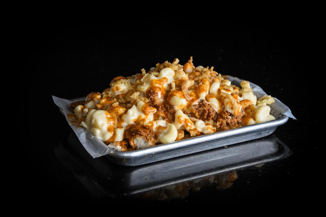 crinkle-cut fries krispy chicken pink sauce mac & cheese nashville sauce crispy onions