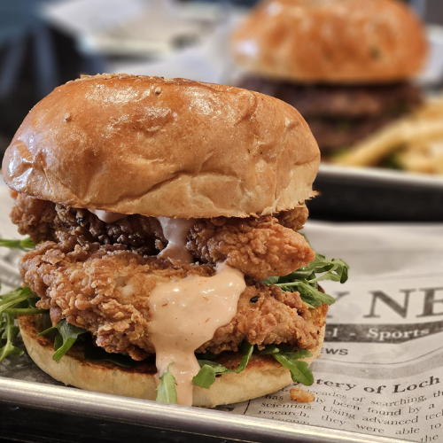 krispy chicken, toasted bun, crispy onions, pickles, lettuce, pink sauce, side of fries.