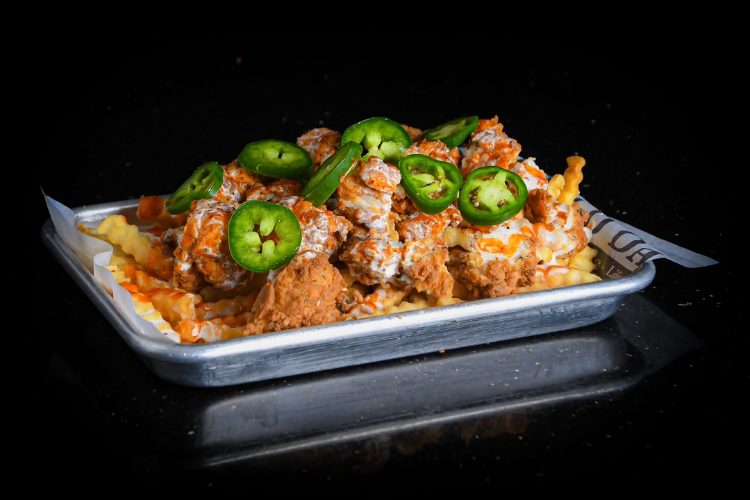 crinkle-cut fries krispy chicken secret white sauce hot sauce lemon seasoning fresh jalapenos
