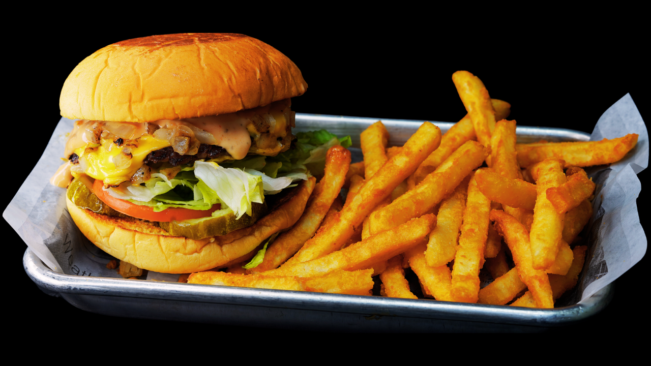 Premium wagyu, American cheese, toasted bun, pickles, grilled onion, tomato, lettuce, pink sauce, side of fries