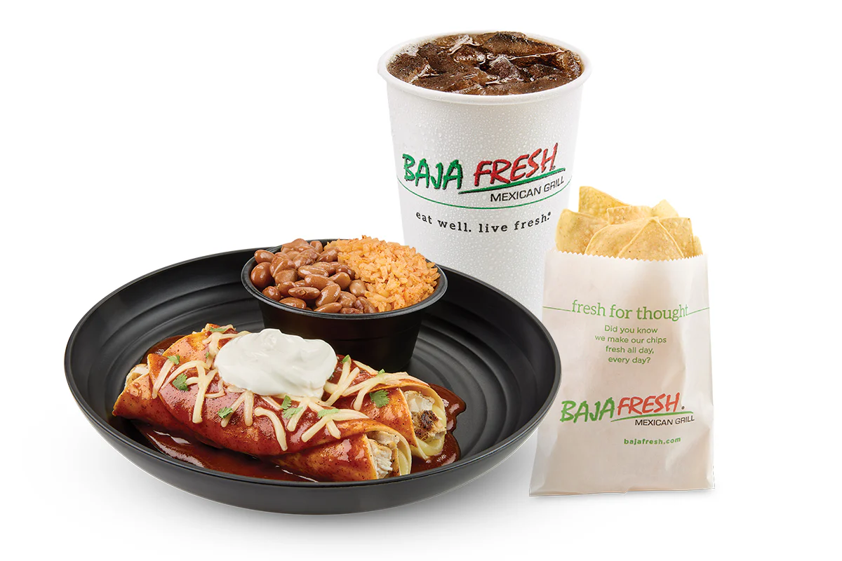 Two corn tortillas rolled with fire-grilled chicken and jack cheese, topped with red chile sauce, jack cheese, sour cream, and cilantro Served with a half order of your choice of rice and beans, tortilla chips, and a regular drink.